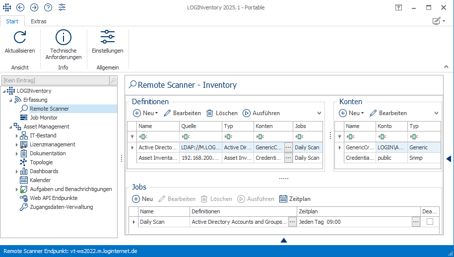 Nur Mitglieder der Rolle Administratoren können über die portable Version den Remote Scanner steuern. Dabei ist zu bedenken, dass vom Client aus der Scan auf dem Server gesteuert wird. Der Name des Servers, der gerade gesteuert wird, ist unten links in der Status-Leiste erkennbar.