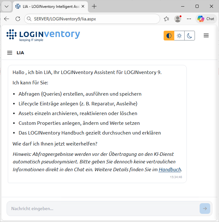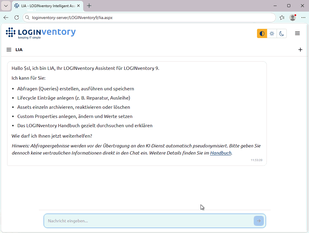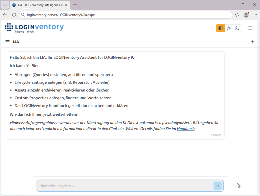 LIA nutzt einen externen KI-Dienst (Azure OpenAI), um zu Ihrer Frage eine textuelle Antwort zu generieren. Dabei werden alle sensiblen Inventardaten automatisch anonymisiert, bevor sie an den Cloud-Dienst gesendet werden.