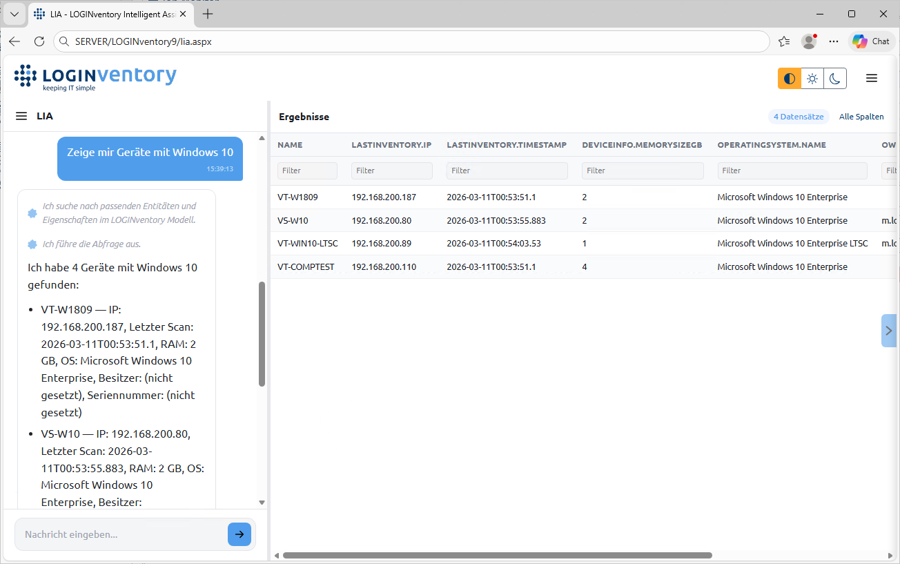 LIA kann das LOGINventory-Handbuch gezielt durchsuchen und Ihnen relevante Informationen zusammenfassen: