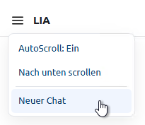 Wir empfehlen, für jedes neue Thema einen neuen Chat zu starten, da LIA immer den gesamten Chat-Verlauf als Kontext für die Beantwortung Ihrer Fragen nutzt. Ein zu langer Verlauf kann die Antwortqualität beeinträchtigen.