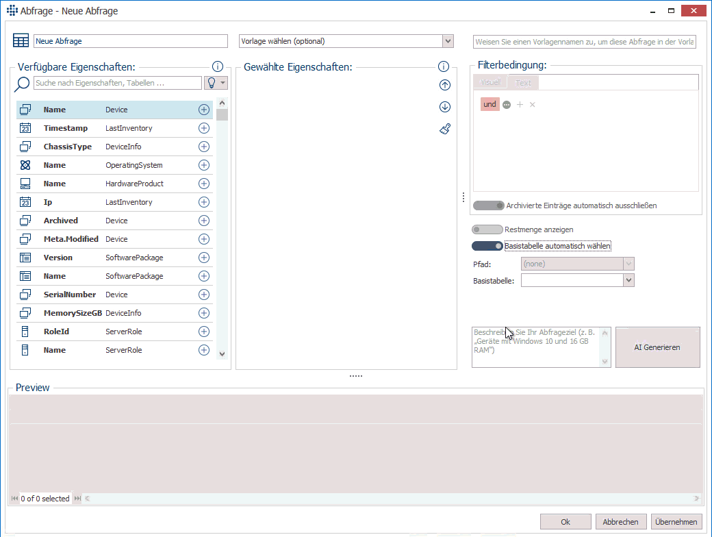 - Abfrageergebnisse: Die Abfrage wird lokal in LOGINventory ausgeführt, und die Ergebnisse werden in der Ergebnis-Tabelle angezeigt. In diesem Beispiel könnte das Ergebnis eine Liste von Geräten sein, die Max Mustermann gehören.