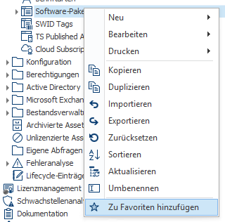 Über einen Rechtsklick auf einen Knoten in der Baumstruktur kann die Funktion Zu Favoriten hinzufügen ausgewählt werden. Daraufhin wird der Knoten im Favoriten-Knoten am oberen Rand der Baumstruktur angezeigt. So können wichtige Knoten schnell und einfach erreichbar gemacht werden.