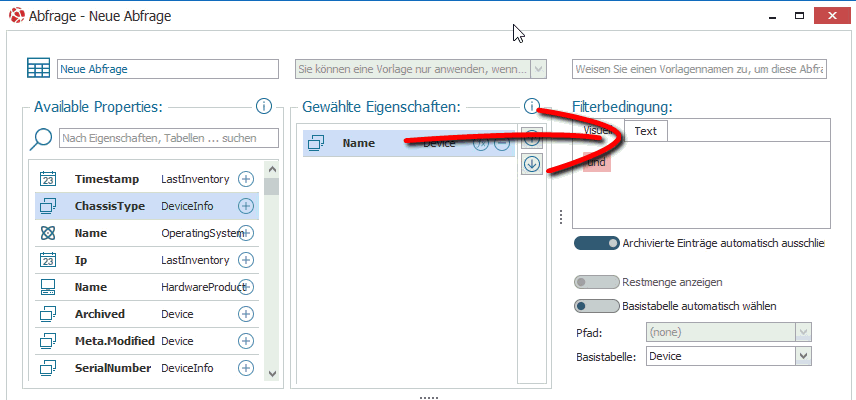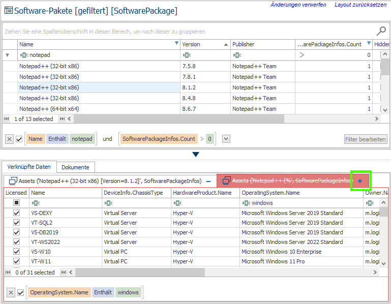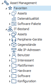 Die Assets befinden sich nicht physisch unterhalb einer bestimmten Abfrage oder innerhalb eines Ordners, wie beim Windows Explorer. Vielmehr entsprechen deren Werte den in der Abfrage definierten Filterbedingungen. Deshalb kann das gleiche Gerät zum Beispiel bei "Windows Server", als auch bei "Virtuelle Maschinen" angezeigt werden.