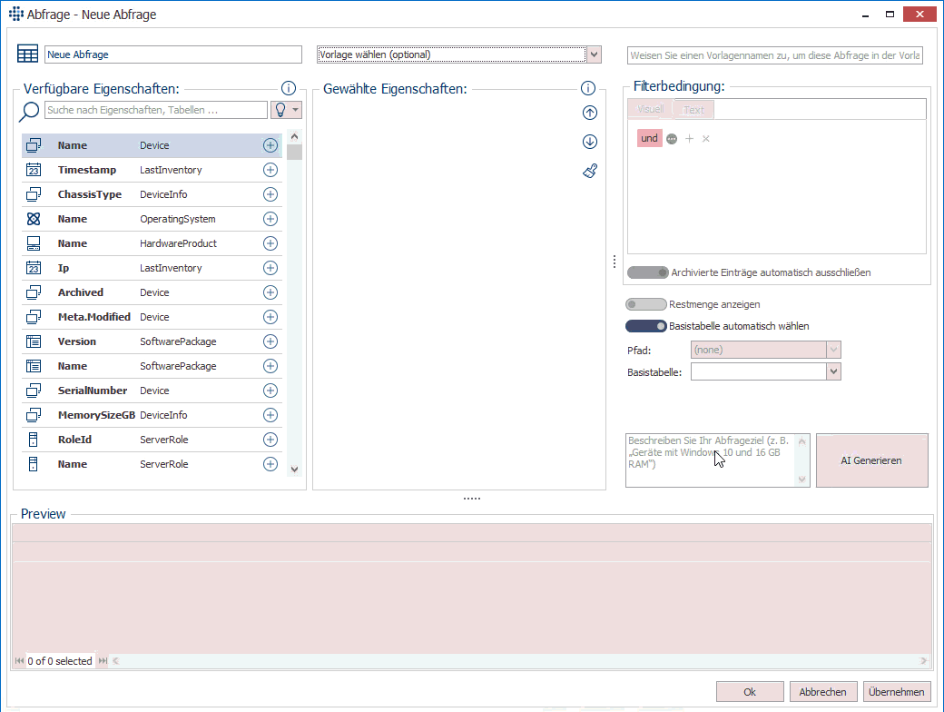 Um Eigenschaften zu befüllen, müssen eine oder mehrere Ergebniszeilen gewählt sein und dann im Widget die gewünschten Werte eingetragen werden.