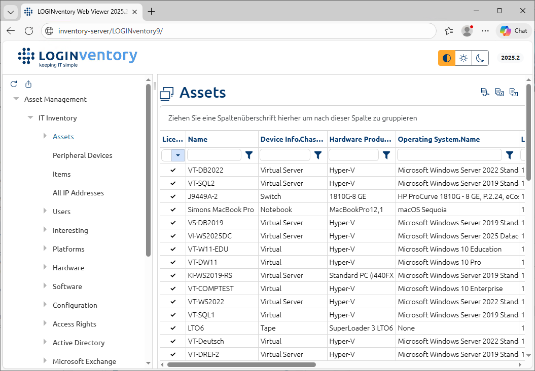 Im Assets-Knoten sind alle erfolgreich erfassten Geräte aufgelistet. Durch einen Doppelklick werden die Details zu dem jeweiligen Rechner aufgelistet.