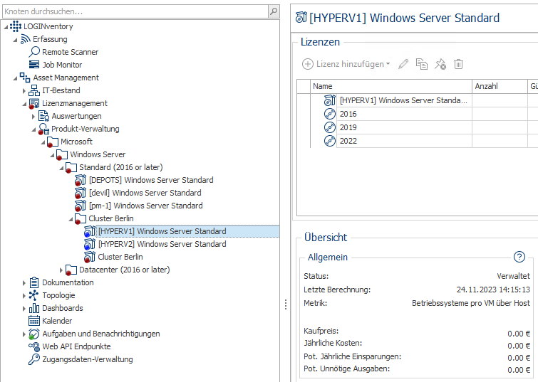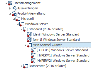 In beiden Fällen ist es daraufhin nicht mehr nötig, Lizenzen an den Produkten, die zum Cluster gehören, zu hinterlegen. Diese wechseln in den Status "verwaltet" (blaue Farbe) und gelten dadurch nicht mehr als unterlizenziert.