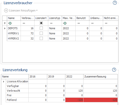 Die Übersicht der Lizenzverbraucher und Lizenzverteilung (ohne hinterlegte Lizenzen) sieht dann z.B. wie folgt aus:
