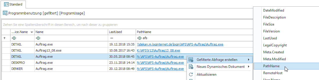 In dieser Abfrage kann die Filterbedingung noch angepasst werden, sodass wirklich nur relevante Einträge übrig bleiben: PathName ähnelt %\AFS\AFS-Auftrag\Auftrag.exe