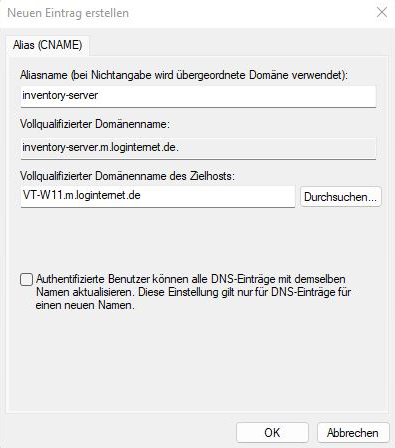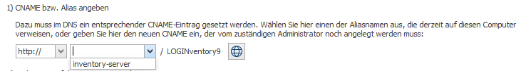 Falls die LOGINventory-Installation jemals auf einen anderen Rechner umgezogen wird, müssten sonst alle Etiketten neu gedruckt werden, oder alle aufrufenden Programme angepasst werden. Dies kann einfach vermieden werden, indem in der URL anstatt des Rechner-Namens ein CNAME bzw. Alias verwendet wird.