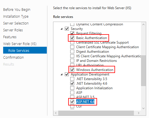 - Sicherheit → Standardauthentifizierung (Security → Basic Authentication) (optional: erlaubt Benutzung von Browsern, die keine Windows-Authentifizierung unterstützen)