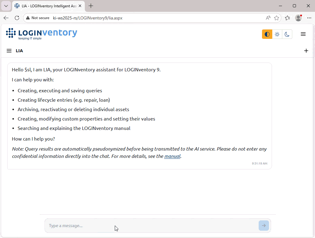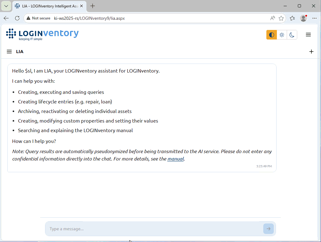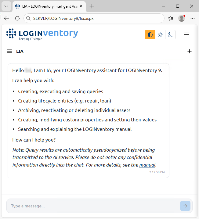 LIA uses an external AI service (Azure OpenAI) to generate a textual answer to your question. All sensitive inventory data is automatically anonymized before being sent to the cloud service.