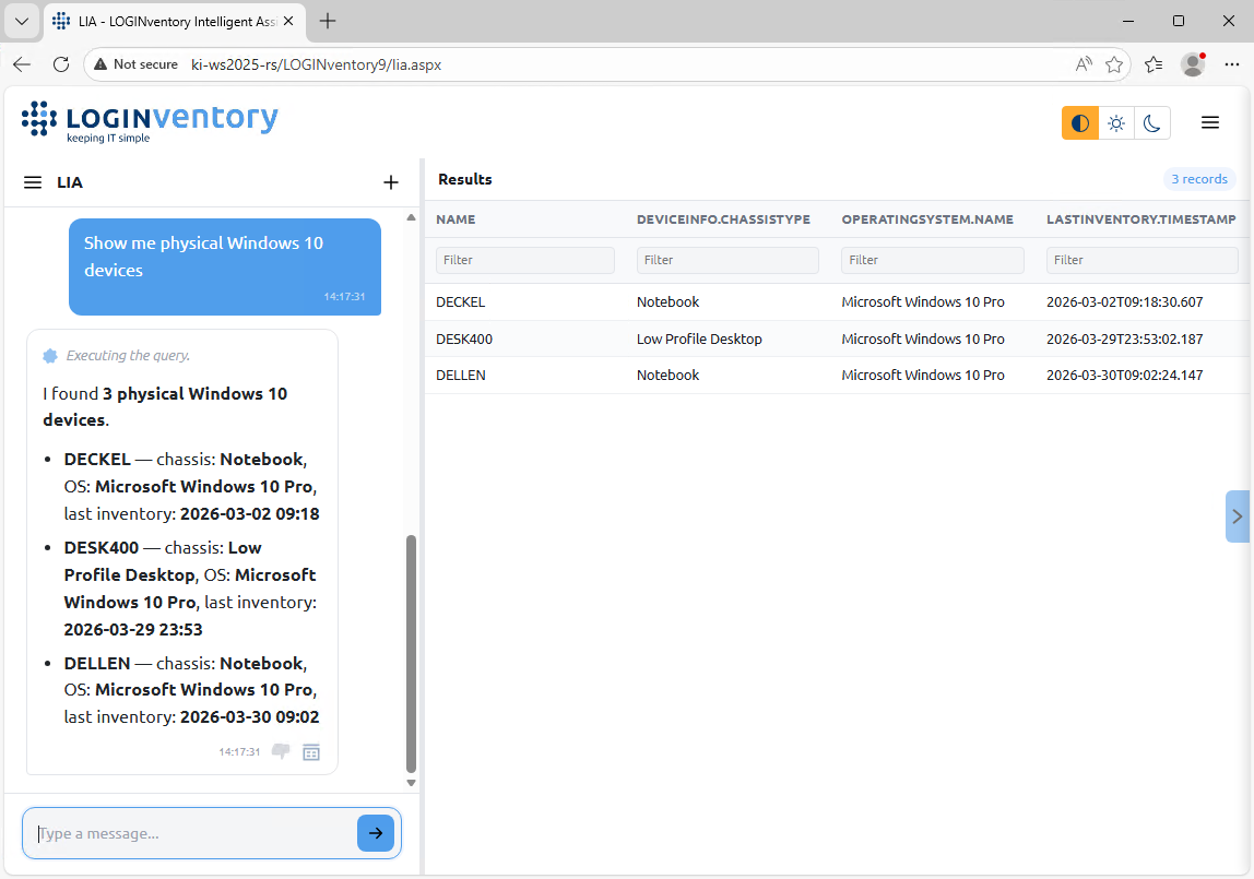 - New chat: Formulate a question or instruction in natural language. E.g., "Show me all devices owned by Max Mustermann".