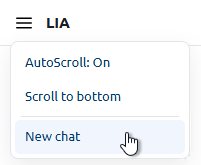 Use the "New Chat" option in the toolbar to start a new chat. This resets the chat history and the results table. LIA starts without knowledge of previous messages.
