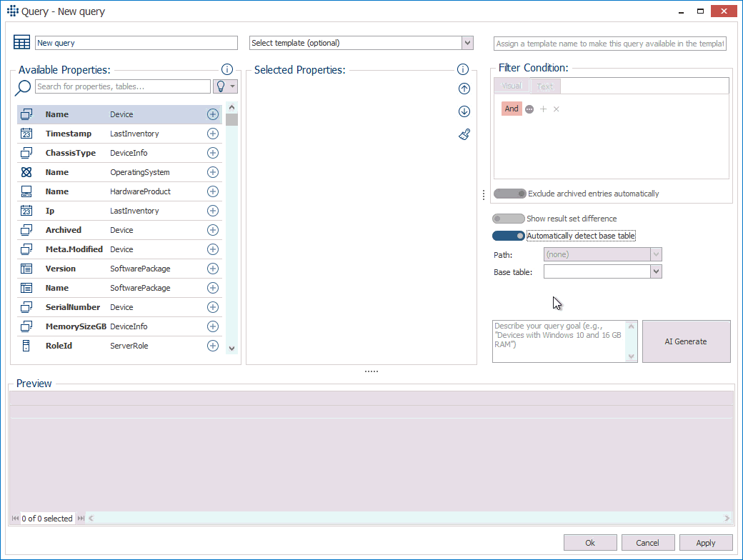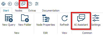- Processing by AI: The AI service processes the question and generates a query to obtain the requested information. E.g., "Select Name, OperatingSystem.Name, LastInventory.Ip where Device.Owner.Fullname = 'Max Mustermann'".